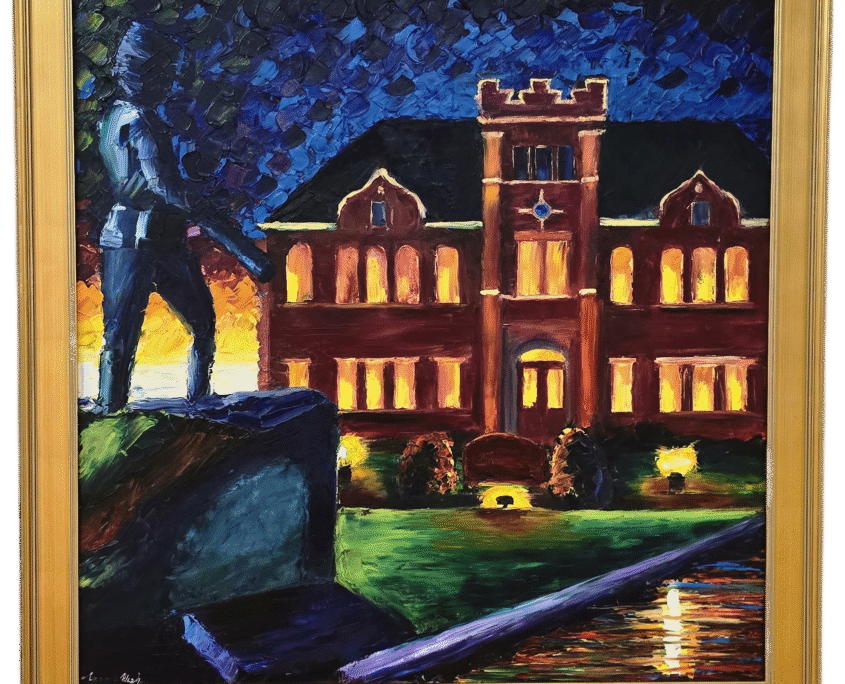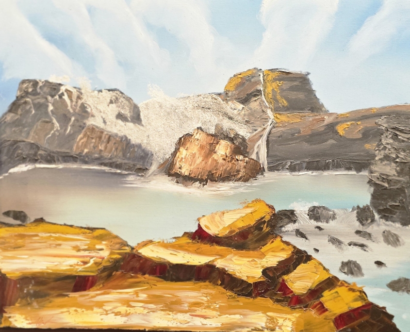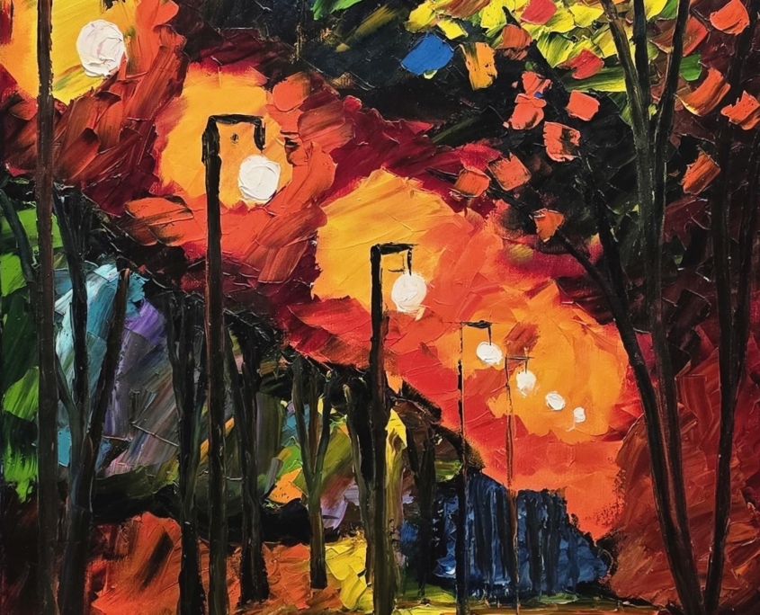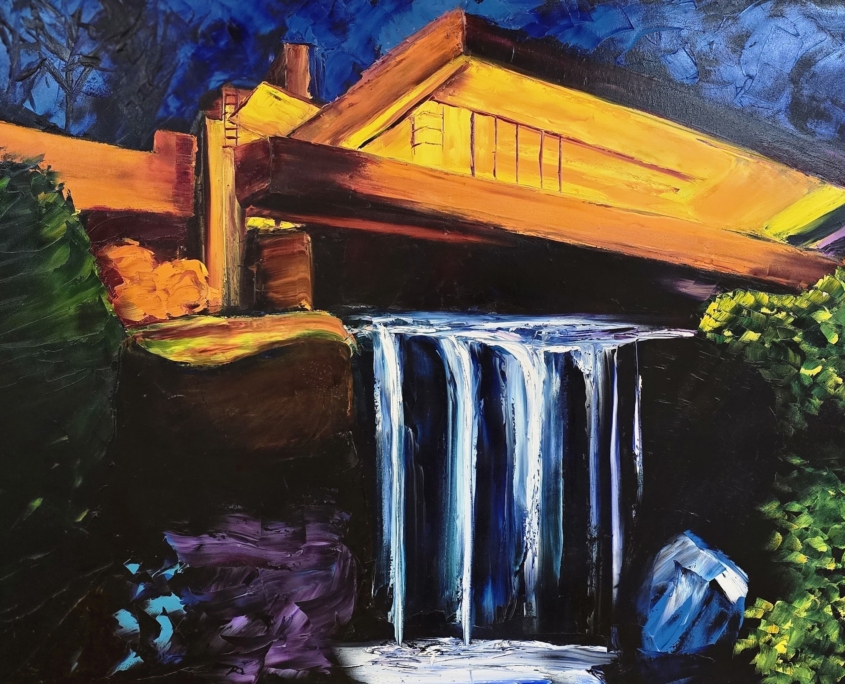 Each piece is built, not brushed—layered in thick, expressive impasto using only palette knives. The result is a visceral blend of saturated color and raw texture. Architecture provides the bones—firm, familiar, structured. But between the lines of concrete, wild things grow. Florals and natural forms erupt through the rigidity, reminders that even within chaos, there is beauty, life, and softness.